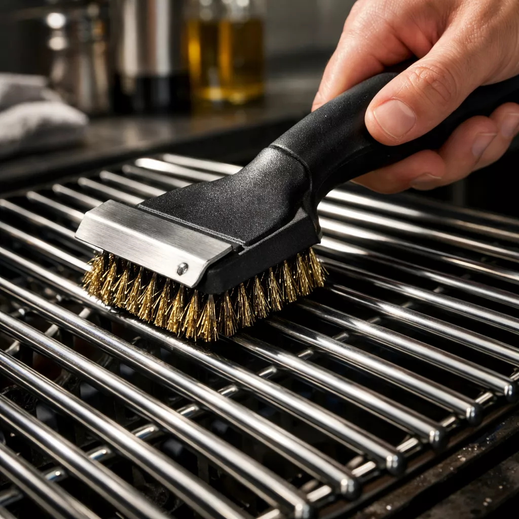 Brosser la grille encore chaude. Une brosse à spirales en inox est préférable aux brosses classiques à poils — plus efficace et sans risque de dépôt de métal sur les aliments lors des prochaines cuissons.