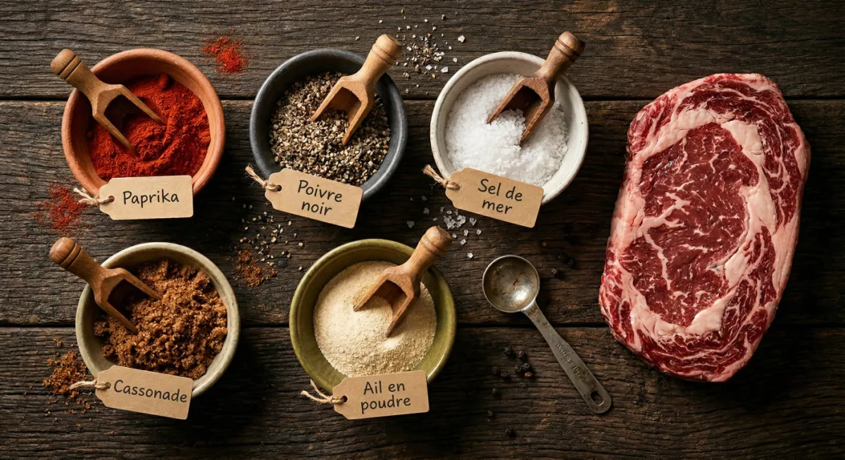 Steaks épais → Sel généreux uniquement, 1h avant. Simplicité et efficacité.