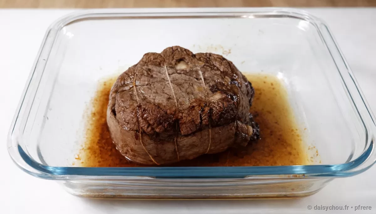 Avant de commencer la cuisson, il est important de sortir le rôti de bœuf du réfrigérateur environ 30 à 45 minutes à l’avance afin qu’il revienne progressivement à température ambiante, ce qui permet une cuisson plus homogène et évite un choc thermique qui pourrait contracter les fibres de la viande et la rendre moins tendre